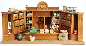 Kaufladen, ca. 1920, B: 58 cm, H: 21,5 cm, Schubladenfächer, 1 Frontleiste liegt lose bei, mit Theke, reichh. Zubehör, alte Tapete an Wand u. Boden
