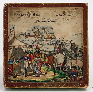 Belagerungs Spiel, Biedermeier, Druck handcoloriert, Spielbrett, 4-tlg., mit 24 Figuren (kompl.), Spielanleitung als Kopie, Orig.-Kart. altersbed. etwas verschlissen