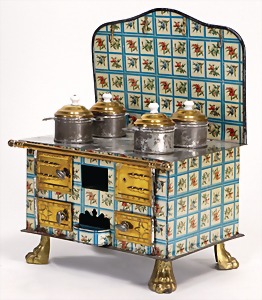 Prächtiger Puppenküchen-Herd, Blech lihogr., Messing/Blech vergoldete Griffstange und Türen, Löwentatzenfüße, H: 30 cm, Orig.-Topfsatz, schöner Orig.-Zust., ca. 1880