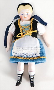 Puppenstuben-Puppe, Ganzbiskuit, 14 cm, Kurbelkopf, fein modell. Haare, bewegl. Arme u. Beine, modell. Schuhe u. Strümpfe, schöne Orig.-Kleidung