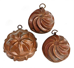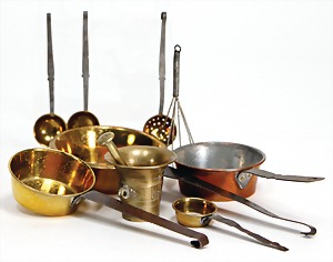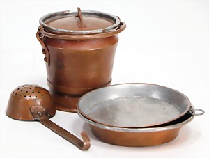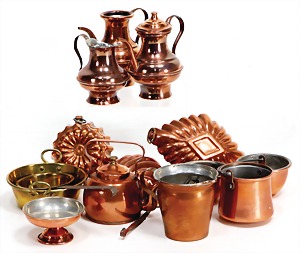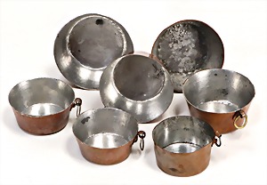 7 Teile Kupfer, gehämmert, innen verzinnt, Durchm. 4 – 6 cm, ca. 1840, für frühe Rauchfangküche