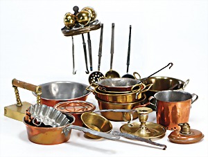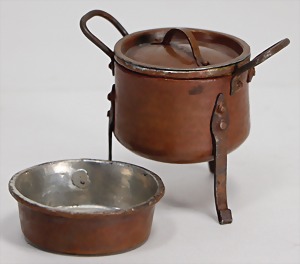 Konv. Puppenküchenteile, Kupfer, innen verzinnt, Krüge, Wasserkessel, Backformen, dazu 1 Messing-Schale, 1 Messing-Pfanne, für mittelgr. Küche, H: Kanne 7,5 cm