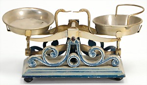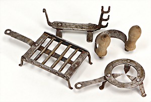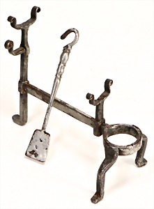 Puppenstuben-Ausschmückungsteile, Eisenblech geschmiedet, für Rauchfangküche, Wiegemesser, Grill, Dreibein, Spießhalter, L: 6,5 cm, H: 4 cm, für Rauchfangküche