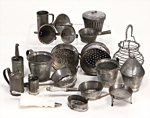 Konv. 16-tlg., Puppenküchen-Weißblech, vor 1900, kl. Puddingform, 4,3 cm, Sieb, Trichter, Pfannen, Eierkorb