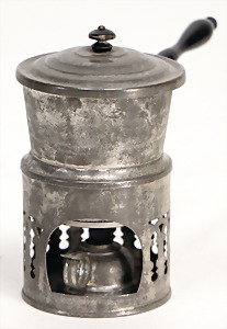 2 Teile Kupfer, gehämmert, ca. 1860, Sieb, Kelle, 1 Eimer mit Deckel, am Eimer Boden 1x neu verlötet, beides innen verzinnt, für Rauchfangküche, dazu 2 Pfannen, gehämmert