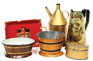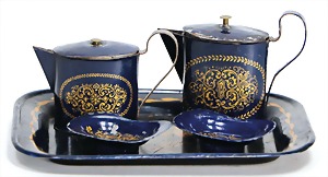 Blech lackiert, mit Stempeltechnik, vor 1900, 2 Kannen, 6 u. 7 cm, 2 Schalen, 1 Platte, kl. altersbed. Lackfehler, schöner Orig.-Zust.