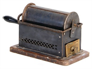 Puppenstuben-Eismaschine, Blech handlackiert, 14,5 cm, 1 Henkel fehlt, kl. altersbed. Lackfehler