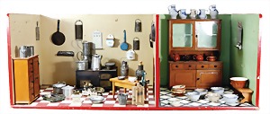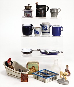 Fundkiste, Puppenküchen-Ausschmückungsteile, Porzellan, Zinn, Keramik, Blech, Holz, einige Möbel, 1900 – 1920, für größere bis mittelgr. Küche