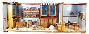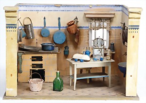 Puppenstubenküche, ca. 1880, B: 86,5 cm, H: 43 cm, T: 50 cm, Orig.-Bemalung, außen u. Boden, Wandbemalung möglicherw. 20 Jahre später, Spannungsrisse am Boden sowie 1 Wand seitl., möbliert, Herd aus der Zeit, reichh. Zubehör, Porzellan-, Blech- u. Holzteile, darunter Kaffeeröster, hochwertiges Weißblech, außenliegender Wasserbehälter, unberührter Dachbodenfund