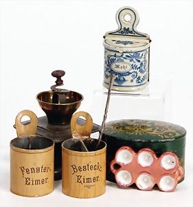 Konv. hochwertige Puppenküchen-Ausschmückungsteile, Brotdose, Blech, 7,5 cm, Fenster-Eimer,Besteck-Eimer, Blech handlackiert, 1 Mehlmetze, Blech lithogr., kl. Pfitzaufform, 1 Schieber, 1 Kaffeemühle, Weißblech