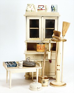 Puppenstuben-Küche, B: 1,24 m, H: 48 cm, 2-tlg., mit Durchgangstür, Bemalung etwas später, Brotschrank u. Vorratsschrank Orig.-Bemalung, reichh. Zubehör, mit Herd