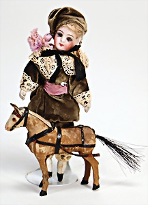 Puppenstuben-Puppe, Biskuitporzellan-Kurbelkopf, braune fest eingesetzte Glasaugen, schöne Bemalung, fest aufgesetzte Perücke, Stoffkörper, Biskuit-Unterarme, restauriert, ausmodellierte Schuhe, alte Seidenkleidung, 15 cm Stehhöhe, dazu kl. Holzpferd mit Echtfell, H: 8 cm, schönes Konv.