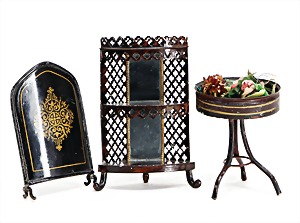Eckregal verspiegelt, 12 cm, 1 Ofenschirm, sehr guter Zust., dazu 1 Blumentisch, Blech handlackiert