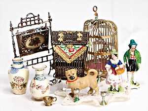 Puppenstuben-Ausschmückungsteile, Zinn, Vogelkäfig (oben etwas verzogen), 1 Zeitungshalter, kl. Schirmständer, 1 Fuß fehlt, 2 Keramik-Vasen, 2 Porzellanfiguren, Bully, Porzellan, 1 Fuß geklebt