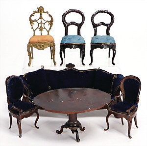 Wohnzimmermöbel, Sofa, 21 cm, 2 Armsessel, blauer Samtbezug, dazu 2 Stühle, hellblauer Seidenbezug, 1 Stuhl Guss