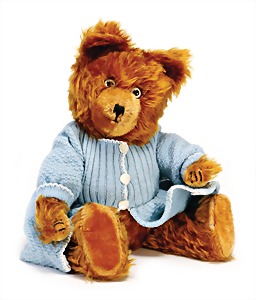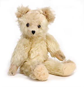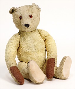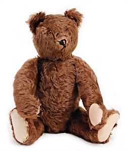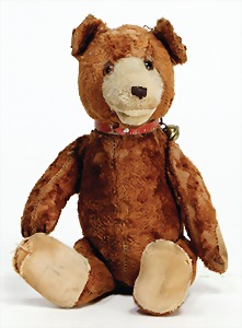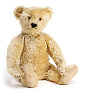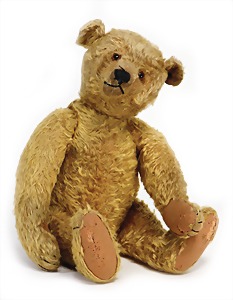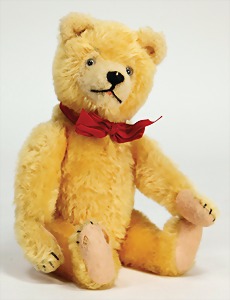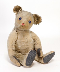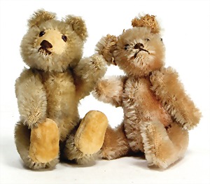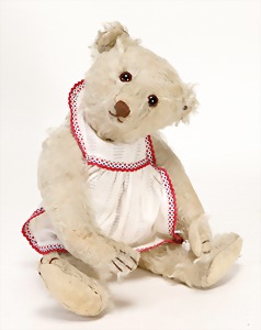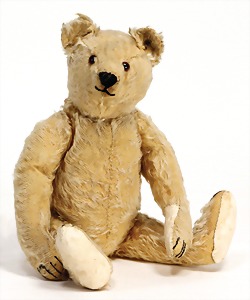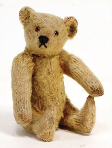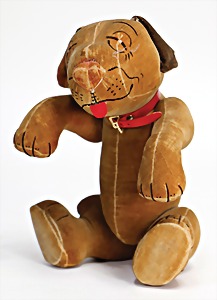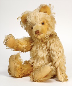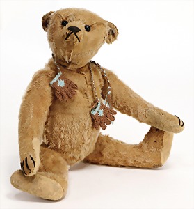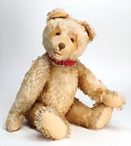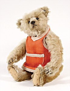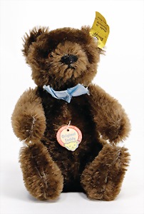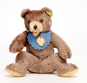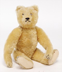 Bär, ca. 1934, mit Knopf, lang gezogenes F, minim. Reste der gelben Fahne, dunkelbraun, deutlicher Buckel, lange abgeknickte Arme, Glasaugen, Nasenspitze leicht berieben, an vereinzelten Stellen etwas Mohairverlust, sonst schöner Zust., rechte Fußtatze mit kl. Löchern, 41 cm