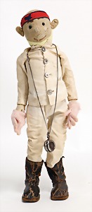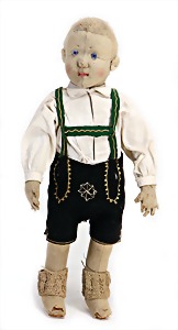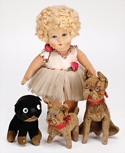 Puppe, 28 cm, Samt, Filzkopf, fest eingesetzte blaue Glasaugen, dazu 3 Samt-Hunde, Glasaugen, wohl Chuck Valley