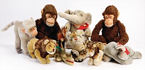Konv. 10-tlg., Nachkrieg, Affen, Elefanten, Krokodil, Okapi, Raubtiere teils mit Knopf, teils mit Fahne, oder mit Schild, bespielt, gut