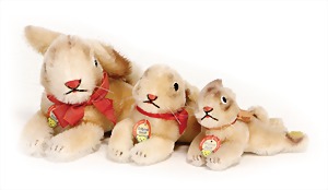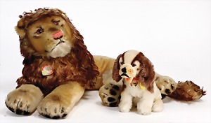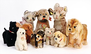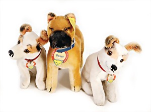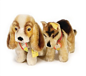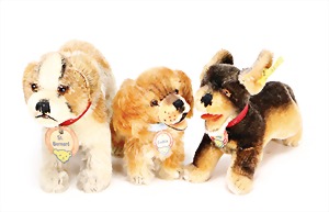 Konv. 3-tlg., Hunde, Nachkrieg, 1x St. Bernhard, mit Knopf, Schild u. Fahne, Brustschild u. Fahne ausgeblichen, stehend, Stehhöhe 13 cm, L: 18 cm, 1x Cockie, in unberührtem Orig.-Zust., Nr. 1310,0, bewegl. Kopf, sehr schöne kräftige Farben, Stehhöhe 10 cm, 1x Lumpi, mit Knopf, Schild u. Fahne, Nr. 4200/11, rennend, 14 cm, guter Zust.