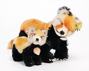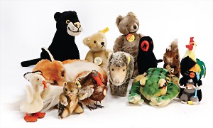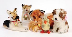 Konv. 6-tlg., Molly, mit Knopf u. Fahne, Nr. 3317, Arco, kompl., Nr. 4340.22, Luxy, kompl., Nr. unleserlich, 18 cm, 1 Frischling, mit Knopf u. Fahne, Nr. 1407.03, Ente, mit Knopf u. Fahne, Nr. 6514, liegender Fuchs, kompl., Nr. 1540/30, ,meist guter Zust.