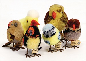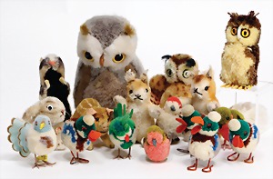 Konv. 15-tlg., 50er/60er Jahre, teils mit Knopf, teils mit Schild oder Knopf u. Schild, bespielt - gut, Vögel, Schwein, liegender Hase, Eule, 1 Tier jünger