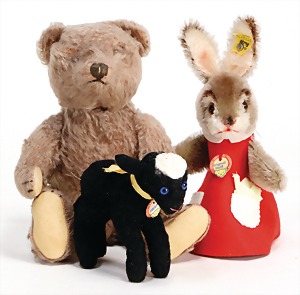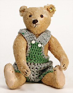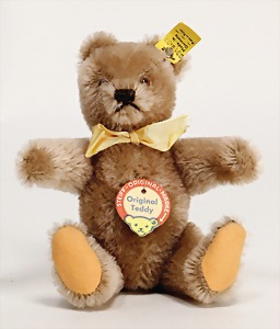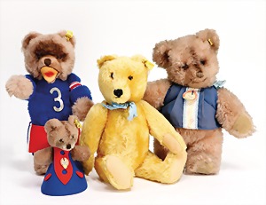 3 Teile, Bär, 70er Jahre, mit Fußballtrikot, silberner Knopf, Nr. 7824/30, Toldi, kompl., Nr. 6200/30, 1 Orig.-Teddy, gelb, Nachkrieg, mit Knopf u. Fahne, Nr. etwas unleserlich, ein wenig verschmutzt, sonst guter Zust., 1 Bett-Hupferl, kompl., Nr. 2170/15