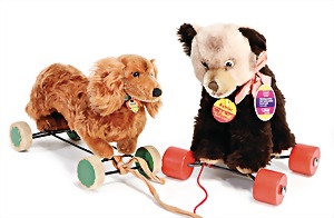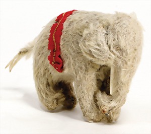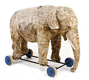 Elefant, ca. 1935, Kunstseidenplüsch, Filz-Stoßzähne, 1 Stoßzahn mit etwas Filzverlust, sowie an vereinzelten Stellen Kunstseidenplüsch abgerieben, auf Holzrädern, H: 40 cm, L: 50 cm, Zugstimme intakt