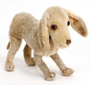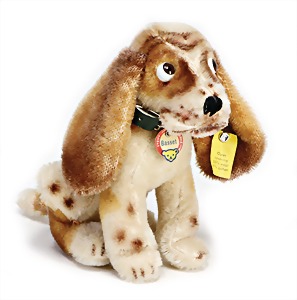 Basset, Nachkrieg, Hund, sitzend, bewegl. Kopf, Schielaugen, mit Knopf, Schild u. Fahne, Nr. 3314, Sitzhöhe 15 cm, unberührter Orig.-Zust., schöne kräftige Farben