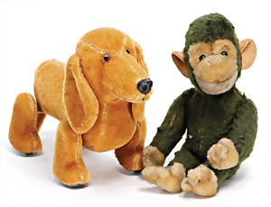 2 Teile, 1 Tricky Affe, 26 cm, bespielt, Stoff am Schwanz fehlt, 1 Trip-Trap Dackel, 30 cm, guter Zust.