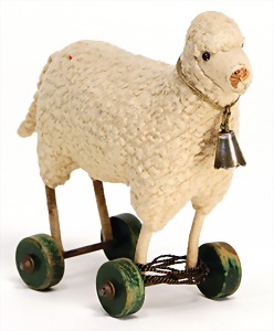 Schaf, 15 cm, auf Holzrädern montiert, Knopfaugen, ohne Knopf, off. Stelle um die Schnauze, teilw. Mohair-Verlust, seltene Gr.