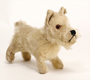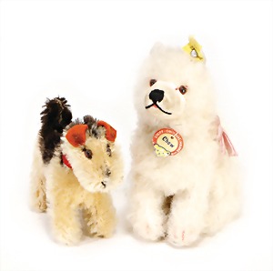 2-tlg., 1x Hund Chow, sitzend, Wollplüsch, weiß, mit Knopf, Fahne u. Brustschild, Nr. unleserlich, 12 cm, leicht verstaubt, 1x Hund Terry, mit Knopf u. Brustschild, rote Schrift auf Brustschild, stehend, Stehhöhe 9 cm