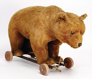 Bär, ca. 1920, 59 cm, auf 4 Pfoten stehend, mit Holzrädern, Zugstimme fehlt, teilw. Mohairverlust, bespielt