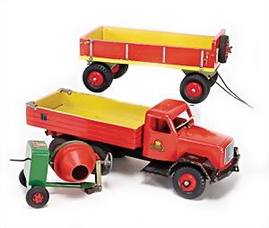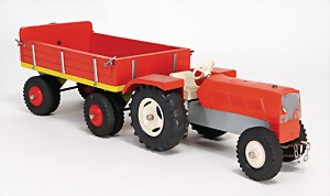 Traktor, 22,5 cm, mit Anhänger, Holz- u. Kunststoffteile, guter Zust., ein paar Kleinteile fehlen