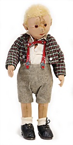 Figur, 45 cm, ca. 1915, Filz, Mittelkopfnaht, Knopfaugen, mit Knopf, Schuhe genagelt mit 38 Steiff-Knöpfen, starke Filzschäden, Kopf teilw. übernäht, Gesicht ausgebessert