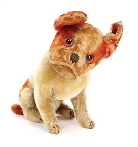 Hund, Nachkrieg, Butch the Cover Dog Albert Staehle, mit Knopf, Schild u. Fahne, Nr. 1317,0, stehend, Stehhöhe 15 cm, L: 19 cm, schöne kräftige Farben, unberührter Zust.