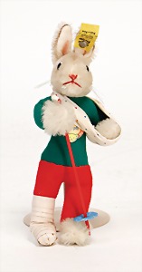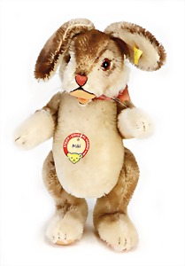 Hase Niki, Nachkrieg, 3-fach gegliedert, bewegl. Kopf, Arme u. Beine, mit Knopf, Schild u. Fahne, Nr. 5328,03, Filztatzen in unberührtem Zust., schöne kräftige Farben, deutliche Knickstelle am Brustschild, sonst sehr schöner Zust.