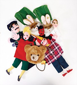 Konv. Handspielpuppen, Filz, 5 Teile, 1 Bärentasche, goldener Knopf, mit Fahne, 2 Hasentaschen, goldener Knopf, Schild u. Fahne