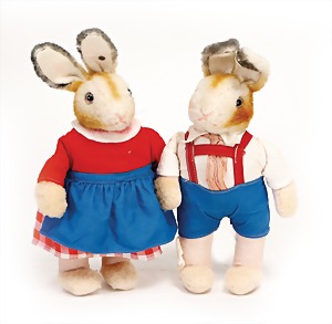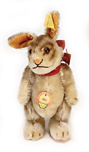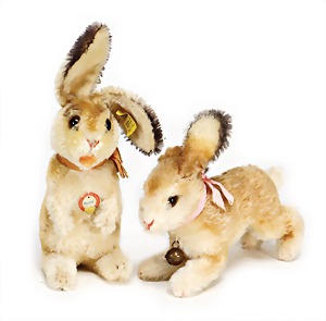 2-tlg., 1x Hase Sonny, sitzend, mit Knopf, Schild u. Fahne, dunkle Färbung auf der Stirn sowie Rückseite, schöne kräftige Farben, Nr. 3310,03, drehbarer Kopf, Sitzhöhe 15 cm, 1x Hase liegend, mit Knopf, Schild u. Fahne, Nr. 2309,00, L: 16 cm, guter Zust., schönes Konv.