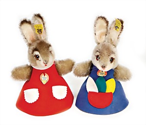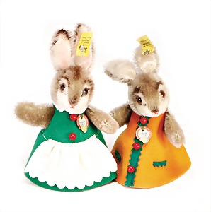 Nachkrieg, 2x Hasen, Eierwärmer, unberührter Orig.-Zust., mit Filzkleid, mit Knopf, Schild u. Fahne, Nr. 3172,15, 18 cm, 1x Hase, mit blauem Samtkleid, mit Knopf, Schild u. Fahne, Nr. 3174/15, unberührter Zust.
