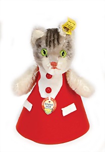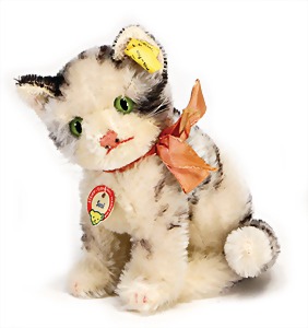 Katze Susi, Nachkrieg, sitzend, drehbarer Kopf, mit Knopf, Schild u. Fahne, Nr. 2780/14, grüne Augen, grau/schwarze gestromelte Färbung, Sitzhöhe 13,5 cm, unberührter Orig.-Zust.
