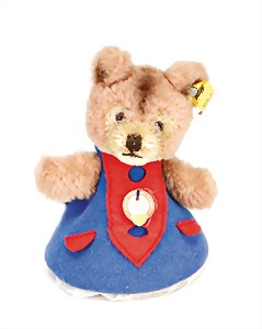 Masken-Bär, Eierwärmer, Nachkrieg, Wollplüsch, zimtfarben, schöne kräftige Farben, mit Knopf, Schild u. Fahne, Nr. 3170/15, blaues Filzkleid, 15 cm, sehr guter Zust., minim. Klebestelle am linken Auge, sonst sehr guter Zust.