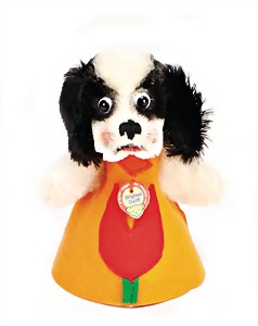 Musik Cocky, Hund, ca. 1960, 17 cm Sitzhöhe, Musikspielwerk intakt, guter Zust., mit Knopf u. Fahne, Nr. 3317.3