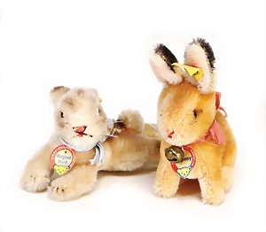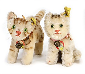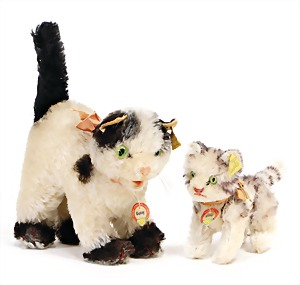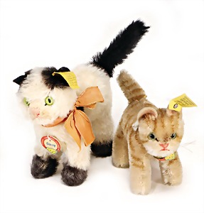 2 Katzen, Nachkrieg, 1x Tapsy, stehend, mit Knopf u. Fahne, Nr. 1311,00, Brustschild an den Rändern minim. verschlissen, 1x Susi, sitzend, mit Knopf, Schild u. Fahne, Nr. ausgeblichen, unleserlich, 11 cm Sitzhöhe