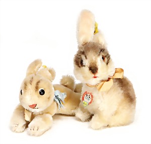 Konv. Hasen, Nachkrieg, 1x Sonny, mit Knopf, Schild u. Fahne, Nr. 3308,03, sitzend, schöne kräftige Farben, 10,5 cm, 1x Hase liegend, mit Knopf, Schild u. Fahne, Nr. 2306,00, sehr schöne kräftige Farben, unberührter Orig.-Zust., L: 10 cm, drehbarer Kopf, sehr schönes Konv.