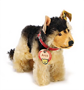 Hund Arco, stehend, mit Samtschnauze, mit Knopf, Schild u. Fahne, Brustschild mit roter Schrift, Nr. 1310,0, Stehhöhe 10 cm, Filzohren, guter Zust.