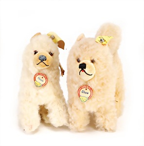 2 Hunde, Nachkrieg, Chow, stehend, Wollplüsch, mit Knopf, Schild u. Fahne, Nr. 1512,00, Stehhöhe 11,5 cm, 1x sitzend, mit Knopf, Schild u. Fahne, ausgeblichen, 10 cm
