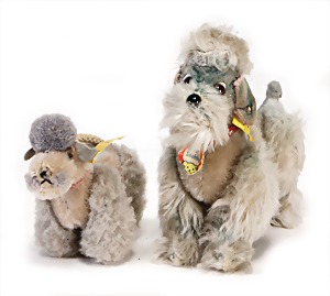2 x Pudel, Nachkrieg, Snobby, mit Knopf, Schild u. Fahne, Nr. 4435/14, in gutem Zust., Brustschild etwas verschlissen sowie Ohren etwas eingerissen, sehr schöne kräftige Farben, bewegl Beine, Stehhöhe 14 cm, 1x Snobby mit Knopf u. Fahne, Nr. 5310,05, Beine Wollplüsch, Nomotta Wolle, Quaste auf dem Kopf, 8 cm Stehhöhe