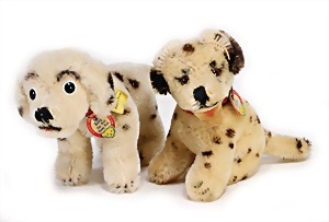 2 Hunde, Nachkrieg, 1x Ronny, Cop. Walt Disney Prod., Dalmatiner aus dem Walt Disney Film "101 Dalmatiner", mit Knopf, Schild u. Fahne, Nr. 1312,00, Fahne ist leicht ausgeblichen, stehend, Stehhöhe 10 cm, 1x Dalmatiner Dally, Brustschild sowie Fahne ausgeblichen, sitzend