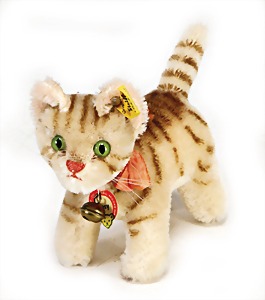 Katze Tapsy, Nachkrieg, mit Knopf, Schild u. Fahne, Nr. 1311,00, grüne Glasaugen, stehend, unberührter Orig.-Zust., schöne kräftige Farben