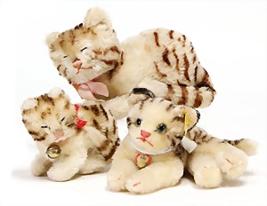 Konv., Fiffy, liegende Katze, kompl. Nr. unleserlich, 17 cm, Snurry, mit Buckel, mit Schild, Schild etw. verschlissen, ohne Knopf, H: 14 cm, Schnurry, mit Knopf, ohne Schild, H: 10 cm, guter Zust.